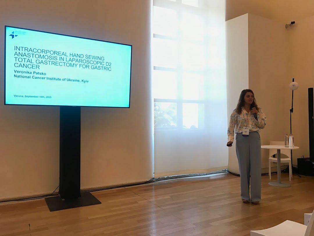 Цього року наші наукові співробітники та лікарі відділу торако-абдомінального онкології, відділення малоінвазивної хірургії, Вероніка Пацко та заступник директора Національного інституту раку Андрій Лукашенко не лише ознайомились з досягненнями колег з усього світу, а й представили усну доповідь “Інтракорпоральні ручні анастомози при лапароскопічній гастректомії із D2 лімфодисекцією”.