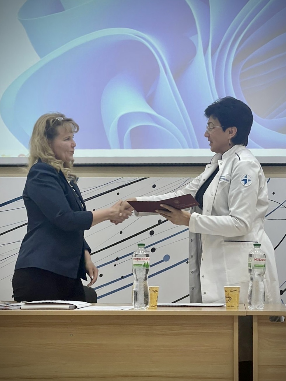На початку засідання голова вченої ради Олена Єфіменко привітала з присвоєнням вченого звання старшого дослідника за спеціальністю 222 Медицина ученого секретаря Наталію Банковську та завідувача науково-дослідного відділення пухлин голови та шиї Олега Кравця.